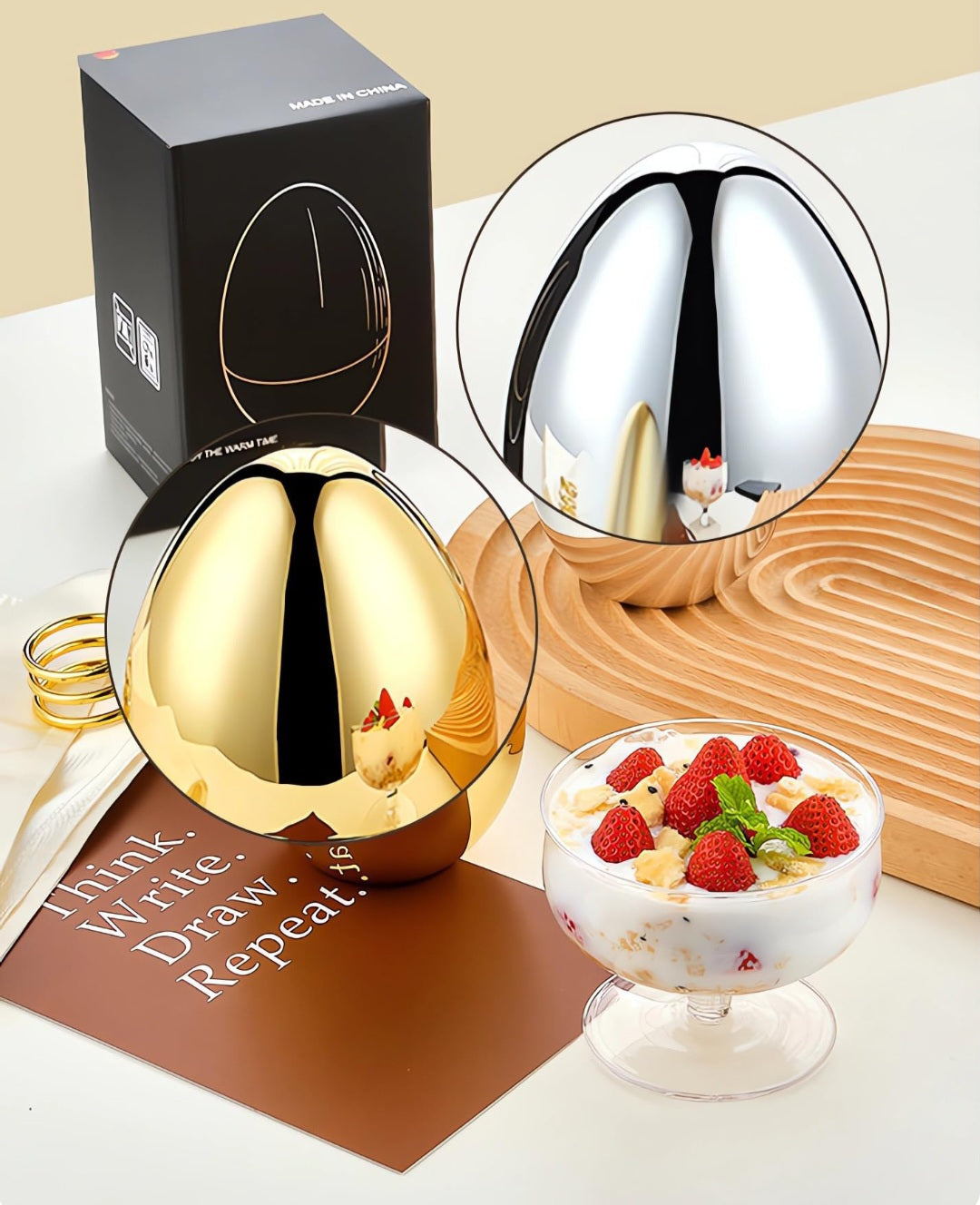 ¢ Egg Shape Storage Rack The surface of the egg shaped storage shelf is mirror, which is a good office decoration. It can be placed on the table to store the spoons and keep the table tidy.
