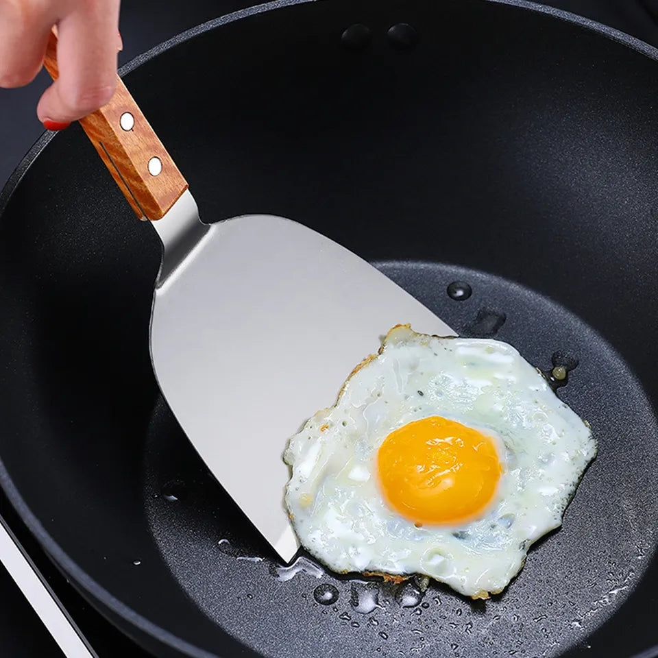 1. STAINLESS STEEL: Barbecue spatula is made of Stainless steel, with flexible head tilt and easy to flip to ensure even cooking.2. APPLICABLE OBJECTS: Grill spatula can be used for frying steak, fish, hand pancakes, dumplings, eggs, egg pancakes, with a wide range of application.3. APPLICABLE PLACES: Hamburger spatula is suitable for sushi restaurant, restaurant, home, hotel, suitable for professional chef in restaurant and food store.4. WOODEN HANDLE: Pizza spatula handle is made of premium wood, environmentally friendly and healthy, with ergonomic design, comfortable and durable.5. EASY TO CLEAN: Burger flipper is smooth and flat, no burr, safe to use, easy to clean, suitable for dishwasher, save cleaning time.